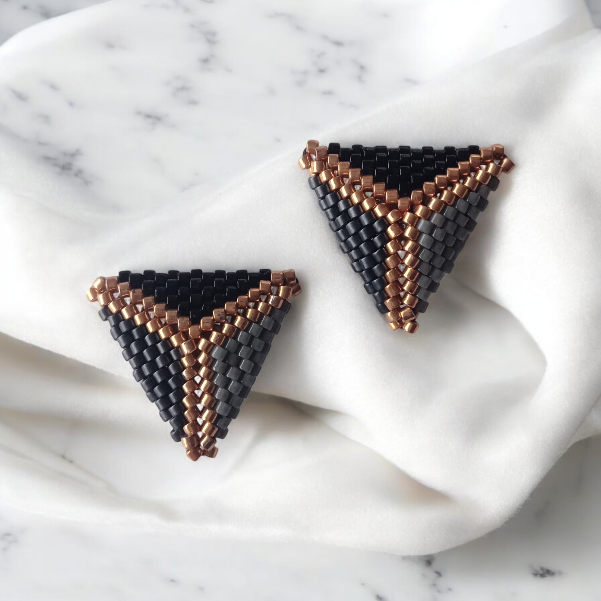 ¡Dale un toque de elegancia moderna a tu look con estos impresionantes aros en 3D! Hechos a mano con la exquisita mostacilla Delica de la marca Miyuki, estos triángulos de 2,5 cm por lado combinan los tonos negro brillante, grafito, gris claro y dorado para crear una pieza única y sofisticada. Perfectos para cualquier ocasión, estos aros destacan por su diseño audaz y contemporáneo que no pasará desapercibido.