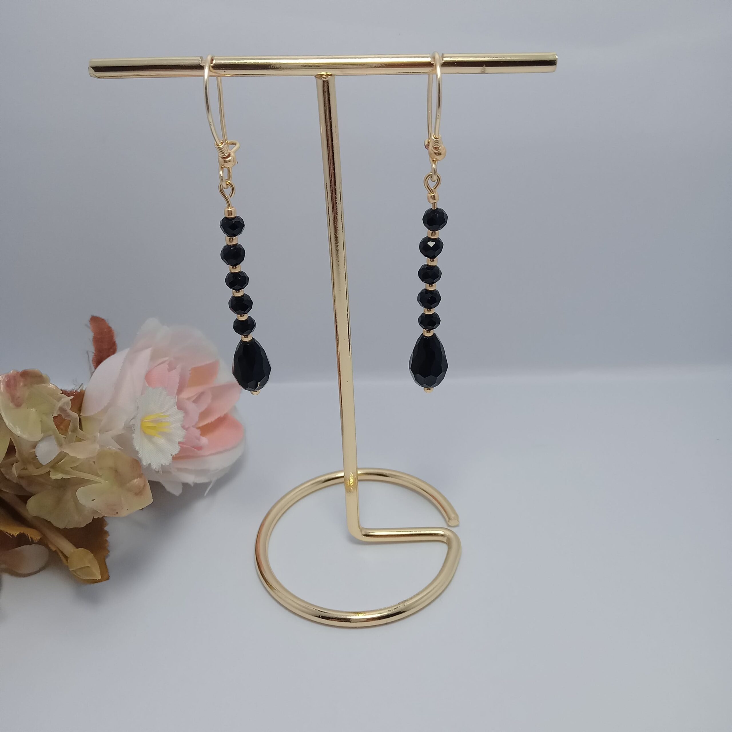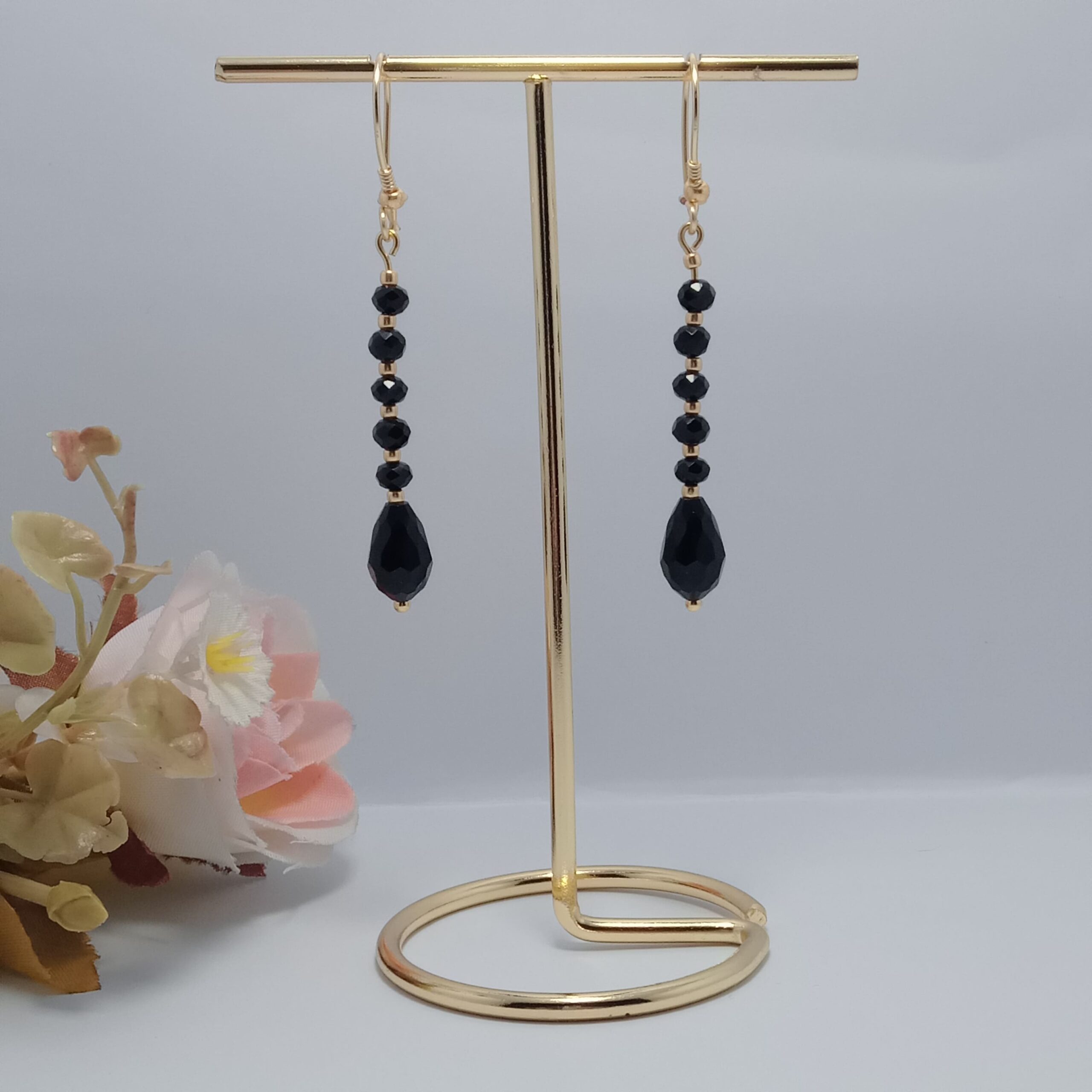 ¡Un diseño que derrocha estilo y personalidad! Hechos con finos cristales facetados negros y trabajados a mano con alambre gold AAA, estos aros destacan por su caída perfecta y su brillo sutil pero irresistible. Livianos, cómodos y radiantes, son ideales para acompañarte en una cena, evento o simplemente cuando quieres sentirte especial.