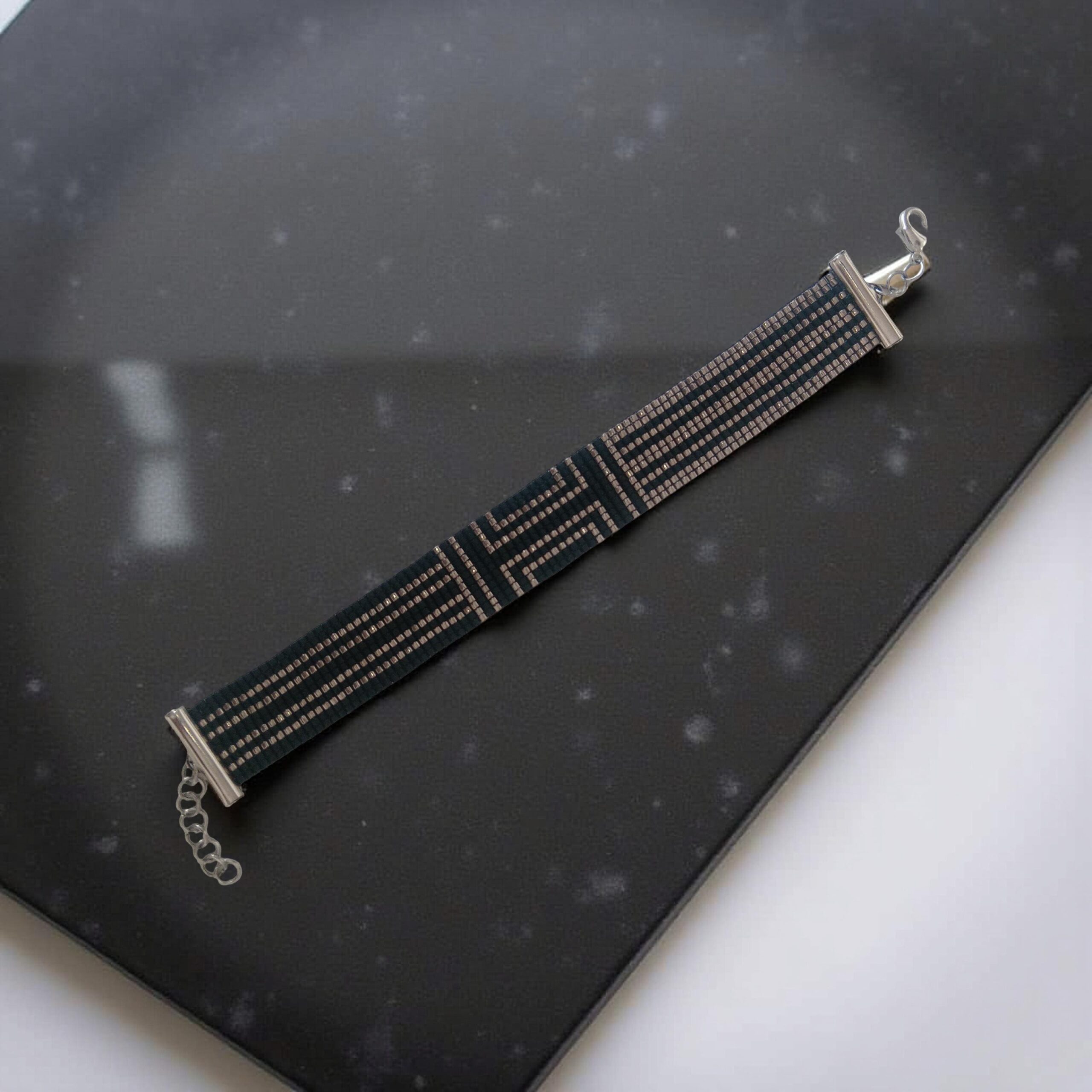 Te presento nuestra Brazalete tribal Miyuki, una joya tejida a mano en telar con diseño original, en impactantes tonos negro y plata. Cada cuenta refleja luz y elegancia, mientras el patrón tribal aporta fuerza, historia y personalidad a tu look.