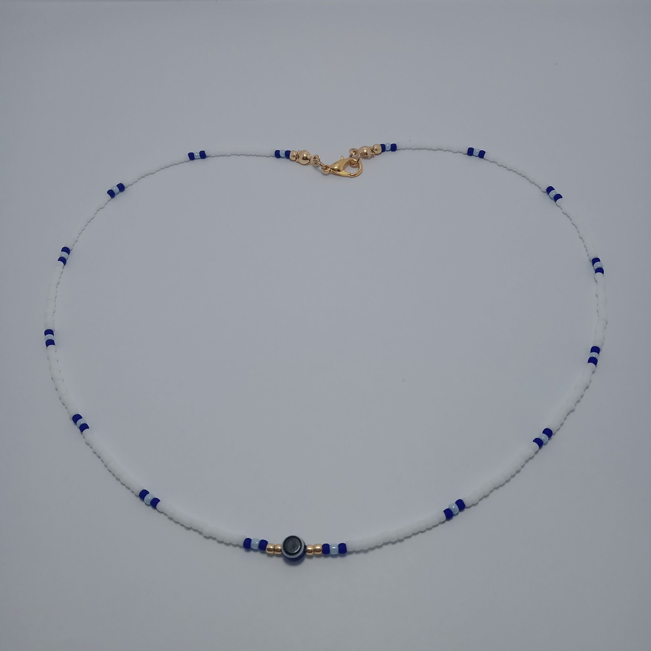 Este collar hecho con rocallas Miyuki combina el blanco puro con el azul intenso, simbolizando calma y confianza. En el centro, un delicado ojo turco, que simboliza la protección contra el mal de ojo y las energías negativas, brindando buena suerte y felicidad.