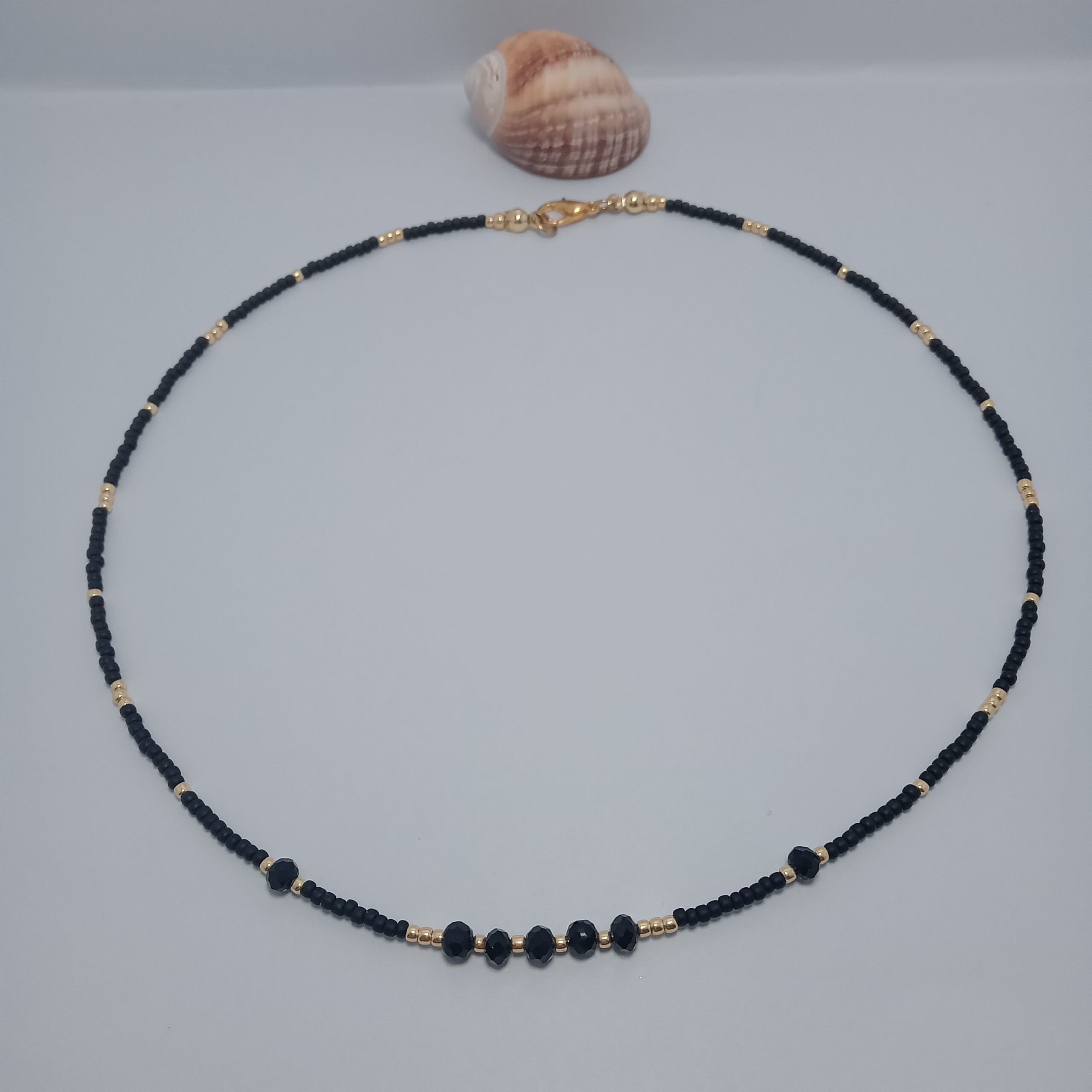 Este collar combina la sobriedad del negro con el brillo sutil del dorado, y se realza con cuentas facetadas que aportan un toque de distinción. Hecho con rocallas Miyuki, es ideal para quienes buscan una pieza sofisticada y versátil, perfecta para el día o la noche.