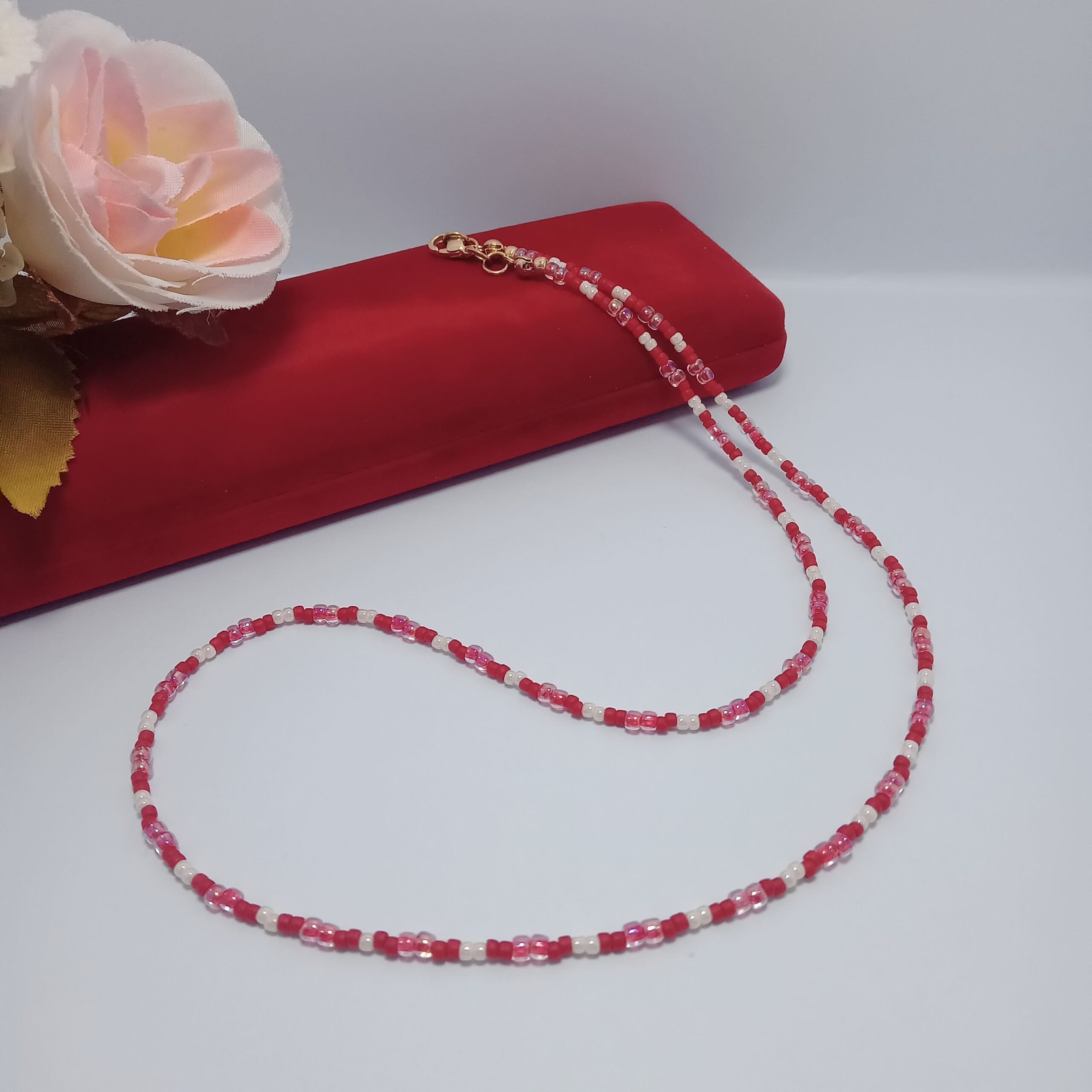 Este hermoso collar está tejido a mano con rocallas Miyuki en tonos rojo, beige y transparencia en rojo, creando una combinación alegre y encantadora. Su diseño delicado y liviano lo convierte en el complemento ideal para cualquier outfit, desde lo casual hasta lo más elegante.