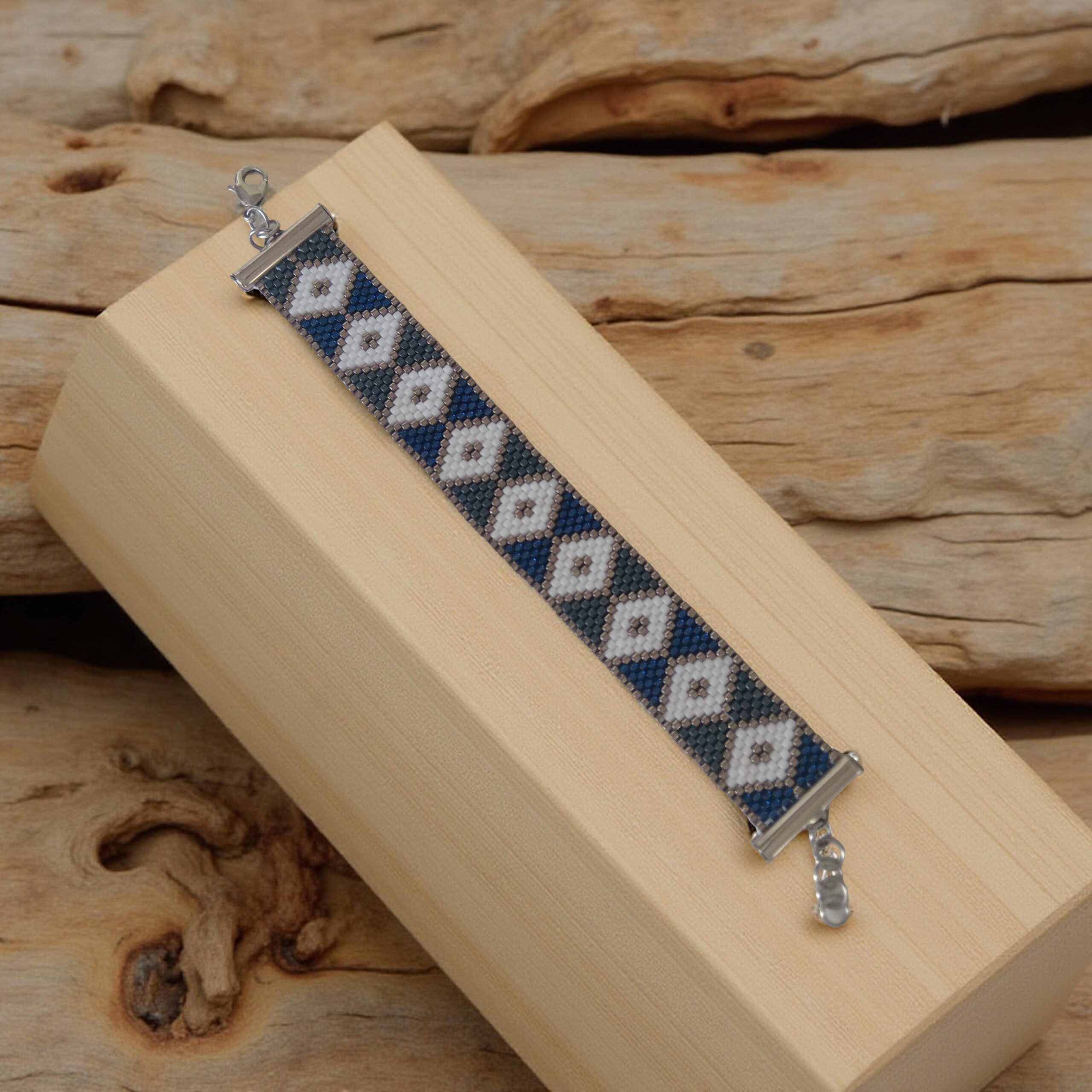 ¡Atrévete a brillar con este brazalete de rombos hecha a mano en mostacilla japonesa Miyuki! Los tonos blanco, azul, grafito y plata se entrelazan en un patrón elegante y sofisticado, creando un diseño geométrico que nunca pasa desapercibido.