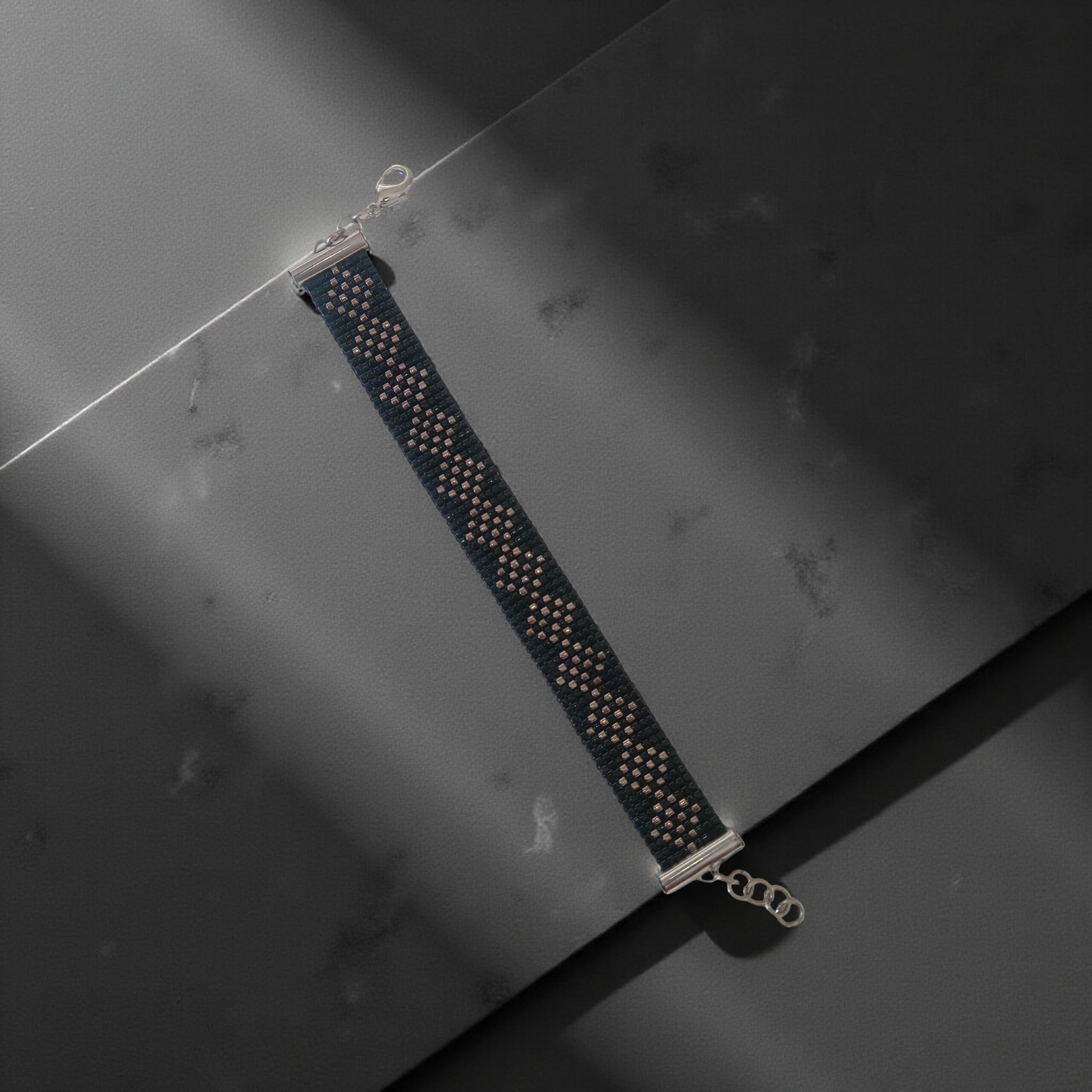 Te traigo nuestra pulsera Miyuki delgada, tejida en telar con delicadeza y precisión, en elegante negro con rombos plateados que brillan como pequeñas joyas. Su diseño minimalista pero impactante le da un aire moderno, sofisticado y súper combinable.